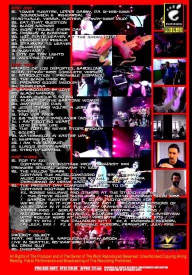 DISC ONE : 01. TOWER THEATRE, UPPER DARBY, PA 12-FEB-1988 Soundcheck & Rehearsal STADTHALLE, VIENNA, AUSTRIA 08-MAY-1988 (AUD) 02. Eat That Question 03. Black Napkins 04. More Trouble Every Day 05. Penguin In Bondage 06. Hot Plate Heaven At The Green Hotel 07. Peaches En Regalia 08. Stairway To Heaven 09. Sharleena 10. Montana 11. City Of Tiny Lights 12. Whipping Post DISC TWO : PALACIO DE LOS DEPORTES, BARCELONA, SPAIN, 17-MAY-1988 COMPLETE VERSION 01. Introduction - Preamble (Espanol) 02. The Black Page #2 03. Packard Goose (Medley) 04. Sharleena 05. Bamboozled By Love 06. Black Napkins 07. When The Lie's So Big 08. Planet Of The Baritone Women 09. Any Kind Of Pain 10. Jesus Thinks You're A Jerk 11. Sofa No.1 12. Find Her Finer 13. Big Swifty - Synclavier (Inst.) 14. I Ain't Got No Heart 15. Love Of My Life 16. The Torture Never Stops Medley 17. Bolero 18. Watermelon In Easter Hay 19. Whipping Post 20. I Am The Walrus 21. Illinois Enema Bandit 22. Strictly Genteel DISC THREE : 01. POP TV 1991 Contains.. Live Footage From Budapest 1991 PREMIERE SPECIAL, GERMANY TV 1992 02. The Yellow Shark Contains The Music composed by Frank Zappa Music conducted by Peter Rundel & Frank Zappa Performed by Frank Zappa & Ensemble Modern 03. THE PRESENT DAY COMPOSER REFUSES TO DIE Contains Footage From... FZ, Ronnie Williams and others at the studio 1962-63 / The Steve Allen Show 1963 / The David Susskind Show 1966 / Garrick Theater 1967 / Cover photo session for We're Only In It For The Money 1967 / Recording sessions of We're Only In It For The Money (Mayfair Studios) 1967 / Vienna 1968 / Berlin 1968 / Royal Festival Hall 1968 / MOI 1968-69 Home Movies / Fillmore West 1970 / FZ interview with Roelof Kiers at home (VPRO 1970) / Stockholm 1973 / KCET TV 1974 / The Palladium 1977 / FZ & Ensemble Modern, LA, July, 1991 / FZ & Ensemble Modern, Frankfurt, July, 1992 BONUS TRACKS : PROJECT OBJECT FEAT. IKE WILLIS & NAPOLEON MURPHY BROCK LIVE IN SEATTLE, 08-MAR-2002 (AUD) 04. Crew Slut 05. Cheepnis