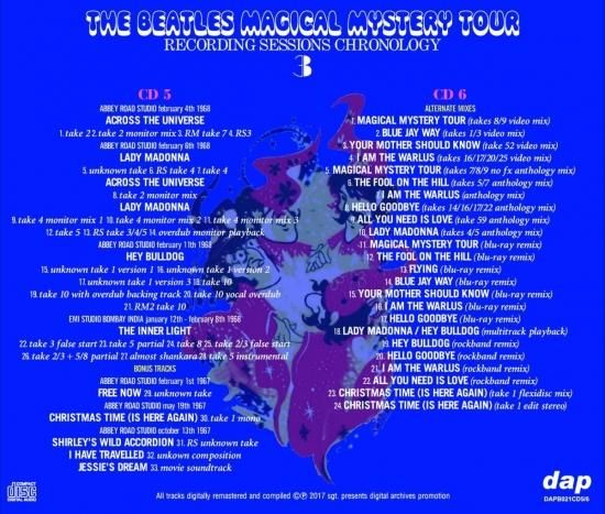 1967年ビートルズの歴史的名盤『サージェント・ペパーズ』のレコーディングに続いて始まった『マジカル・ミステリー・ツアー』の貴重なセッション記録といえるリハーサルやスタジオ・アウトテイク、リミックス音源を時系列にまとめた究極の音源コレクション”レコーディング・セッションズ・クロノロジー”がCD6枚組セットで新登場!全世界に衛星生中継された画期的な「愛こそはすべて」のレコーディング過程や当時ミュージック・ライフ誌の取材でアビー・ロード・スタジオの中で記録された通称”ルミ・テープ”で知られる「フール・オン・ザ・ヒル」の珍しいリハーサル模様が最新リマスター音源で収録。日本へのメッセージ含めまさに歴史的発掘音源というべき貴重な記録です。さらにビートルズ自らが企画制作したTV番組『マジカル・ミステリー・ツアー』のサウンドトラックとなる「アイ・アム・ザ・ウォルラス」等からシングル「ハロー・グッドバイ」「レディ・マドンナ」当時未発表となった「ヘイ・ブルドッグ」や「アクロス・ザ・ユニヴァース」の初期テイクまで当時のレコーディング・セッション記録をほぼ時系列に収録。近年新発掘されたアップグレード音源や初登場のリマスター音源含め現存する関連音源をベスト・クオリティで全162トラック約8時間に渡り完全網羅しています。ここまで纏め上げた内容としては初登場となる注目のスタジオ・セッション集大成!ビートルズ音源研究には欠かせない究極のコレクターズ・アイテムです!!
