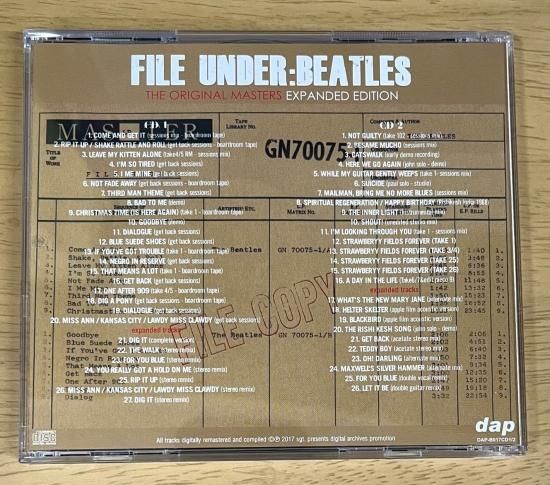80年代当時それまで聞くことが出来なかったビートルズの未発表音源を初めて収録し世界中のビートルズ・コレクターに衝撃を与えた『ファイル・アンダー』。その内容は後に企画されるも未発売となった『セッションズ』さらにその後『アンソロジー』として日の目を見ることになるビートルズの未発表音源を初めて蔵出しして試聴したEMI会議室での隠密録音による”ボードルーム・テープ”そしてアセテート盤からの「バッド・トゥ・ミー」「グッドバイ」さらに”ゲット・バック・セッション”からの音源をまとめたものでいずれも貴重な未発表音源が初登場となったことでベスト・セラーとなりその後数多くのコピー盤も出回りました。但し当時注目された収録音源のほとんどは不完全な編集やモノラルだったりで数年後『セッションズ』が登場し”ボードルーム・テープ”音源が高音質で収録されさらに『アンソロジー』で公式リリースされたりとその価値が薄れたものの今回のリリースではそのオリジナル原盤からさらに遡って同じテイクでもステレオ・セパレーションの異なるミックス違いやモノラルだった”ゲット・バック・セッション”をステレオ化する等元になったオリジナル・マスター音源を現存する最高のクオリティで収録。アナログ盤や後の『セッションズ』と比較しても隔世の感がある大幅なアップグレードになってます。さらにエクスパンデッド・エディションでの追加音源は映画『レット・イット・ビー』からのリアル・ステレオ・リミックスや初登場リミックス音源も収録。『ファイル・アンダー』をここまで高音質化して復刻するのは初登場となる注目のリリースです。またエクストラ・エディションには本編未収録音源がまとめられておりこちらにも同じテイクでもステレオ・セパレーションの異なるミックス違いを多数収録。公式『アンソロジー』では疑似ステレオだった「ザット・ミーンズ・ア・ロット」のリアル・ステレオ・バージョン等その後の『セッションズ』や『アンソロジー』に収録されている音源の別ミックスを聴くことが出来ます。アナログ世代のビートルズ・コレクターにとってマスト・アイテムだった名盤『ファイル・アンダー』を永久保存の2017年最新編集エディションでお届けします!